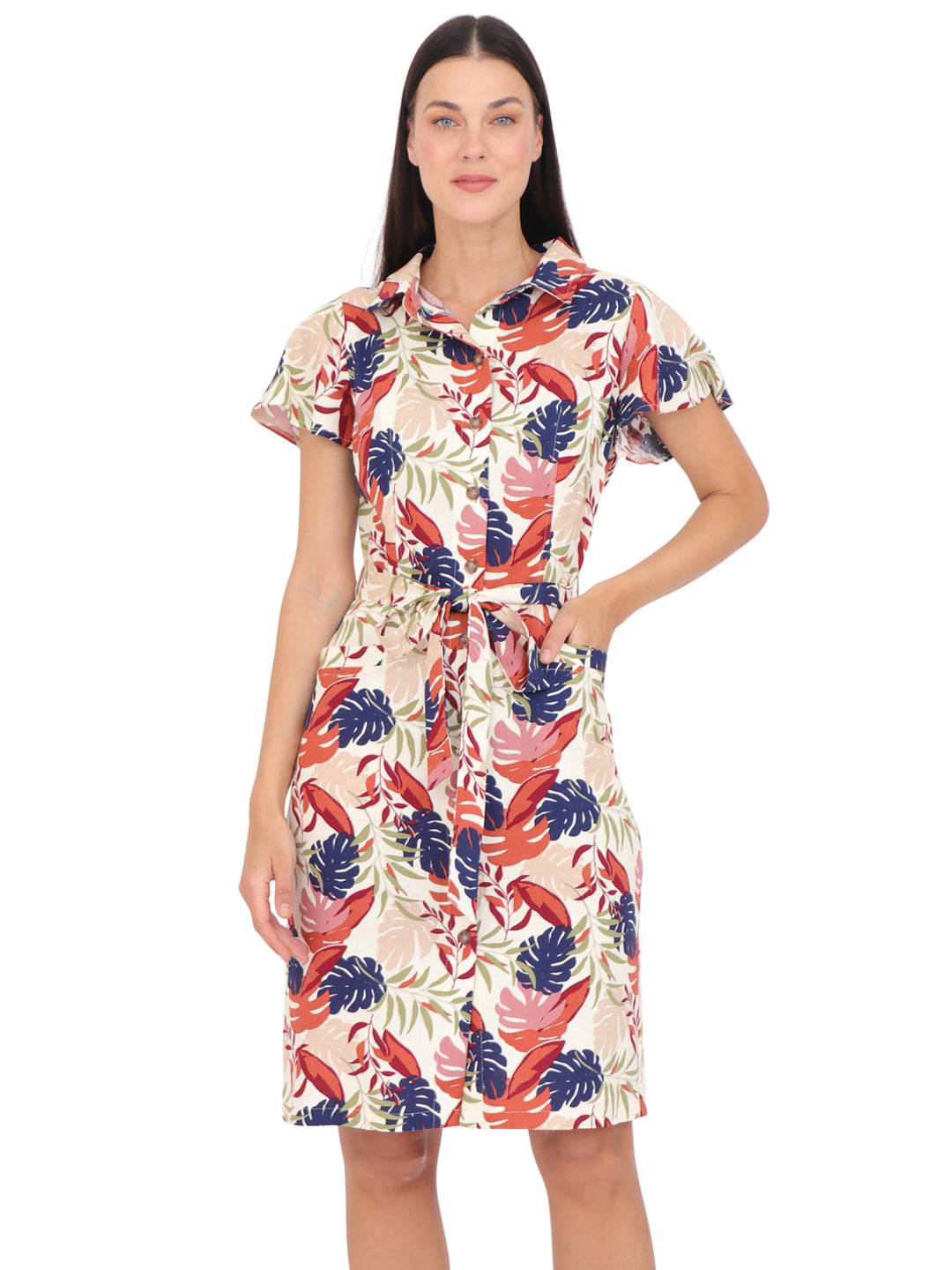 Vestido Cuello Camisero, Manga Corta, Recto,Botones al Frente, Estampado